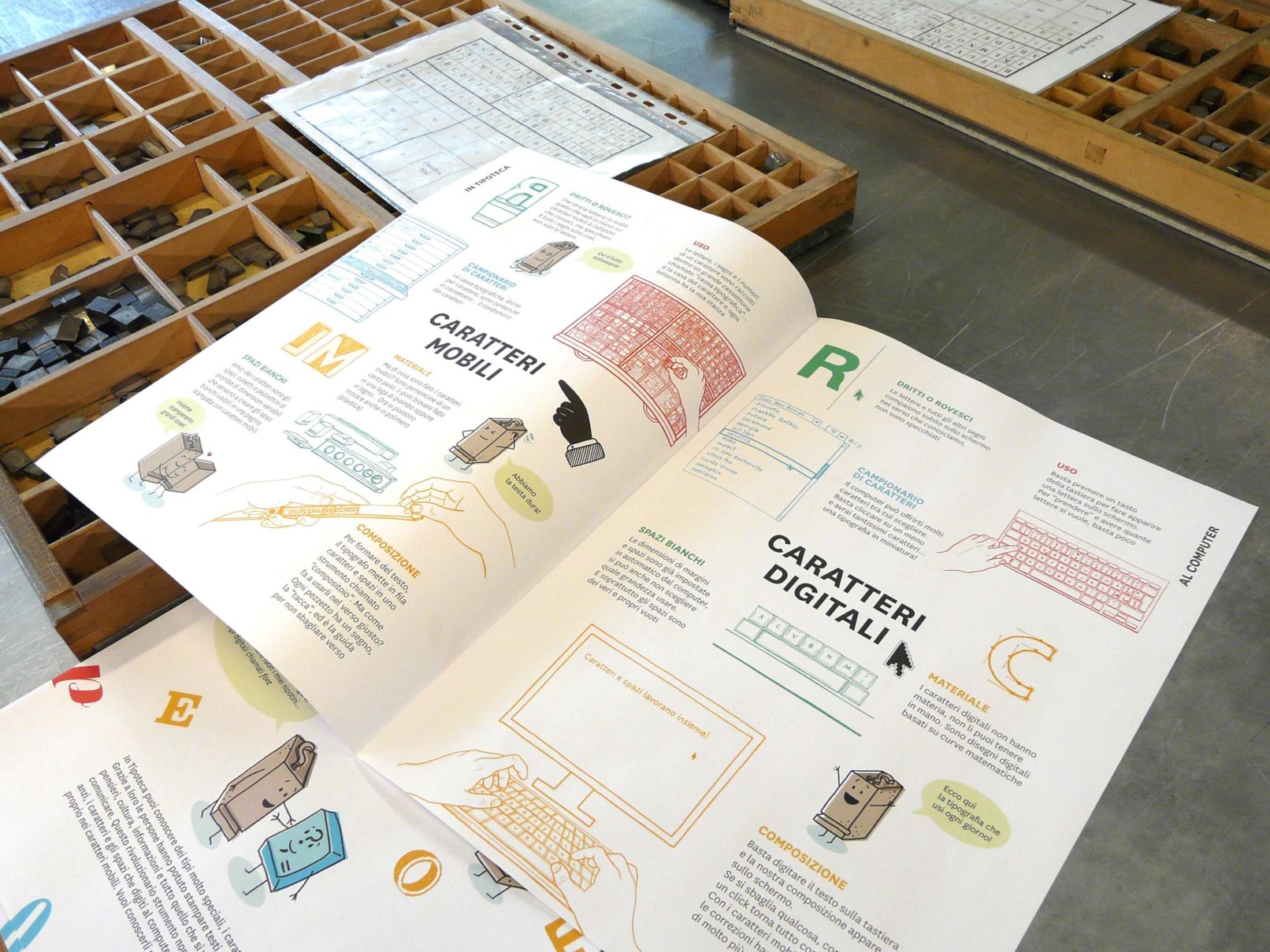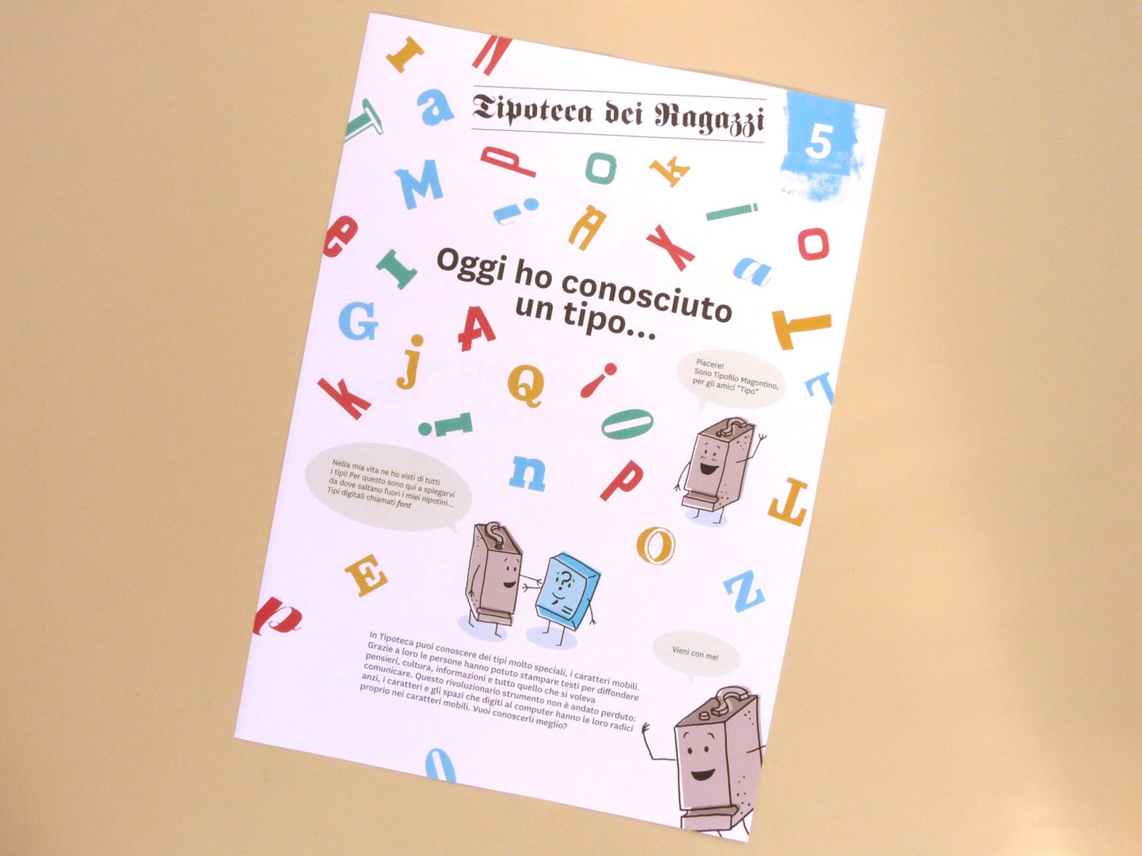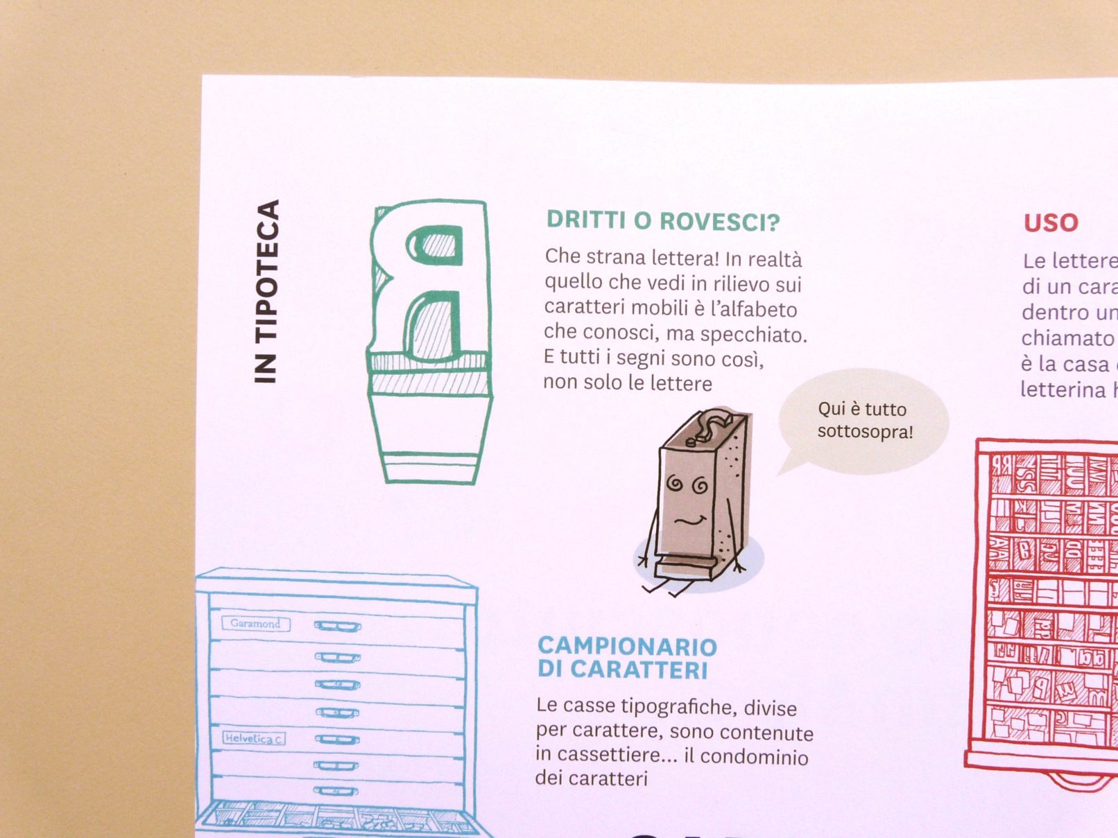 In Tipoteca da settembre a maggio c’è un fermento di piccole e grandi testoline… Quasi ogni giorni si può incontrare almeno una classe in visita o al banco dei caratteri per partecipare al laboratorio di stampa. Questo pieghevolone serve proprio a questo, a dare uno spazio ai ragazzi per stampare, portandosi però a casa qualcosa in più.
