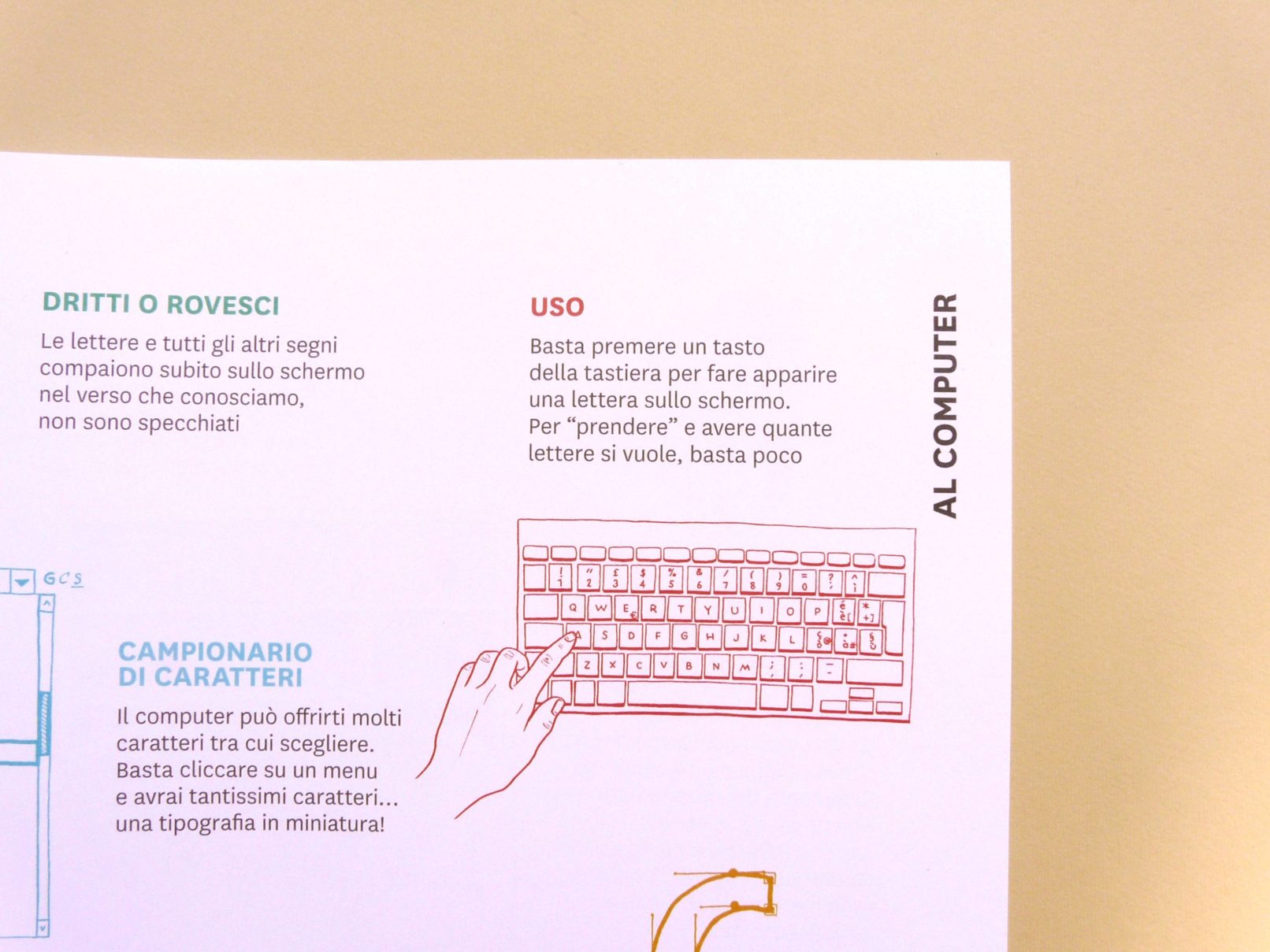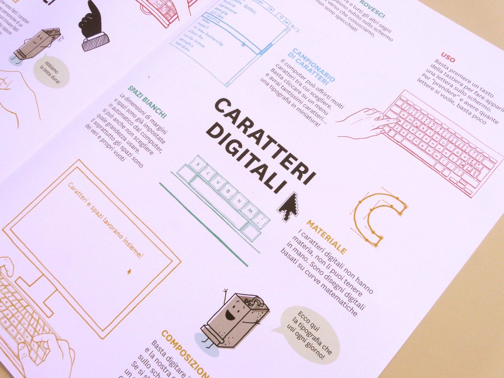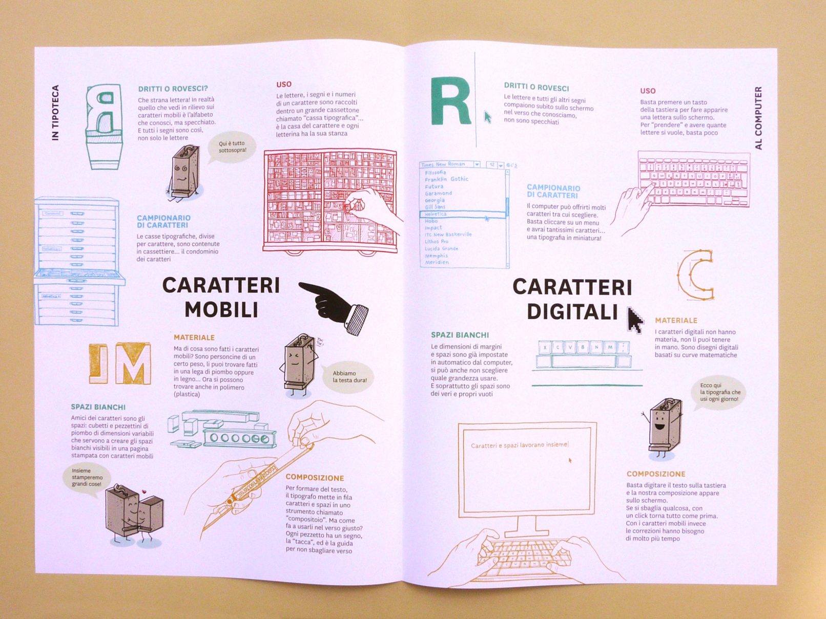 In Tipoteca da settembre a maggio c’è un fermento di piccole e grandi testoline… Quasi ogni giorni si può incontrare almeno una classe in visita o al banco dei caratteri per partecipare al laboratorio di stampa. Questo pieghevolone serve proprio a questo, a dare uno spazio ai ragazzi per stampare, portandosi però a casa qualcosa in più.